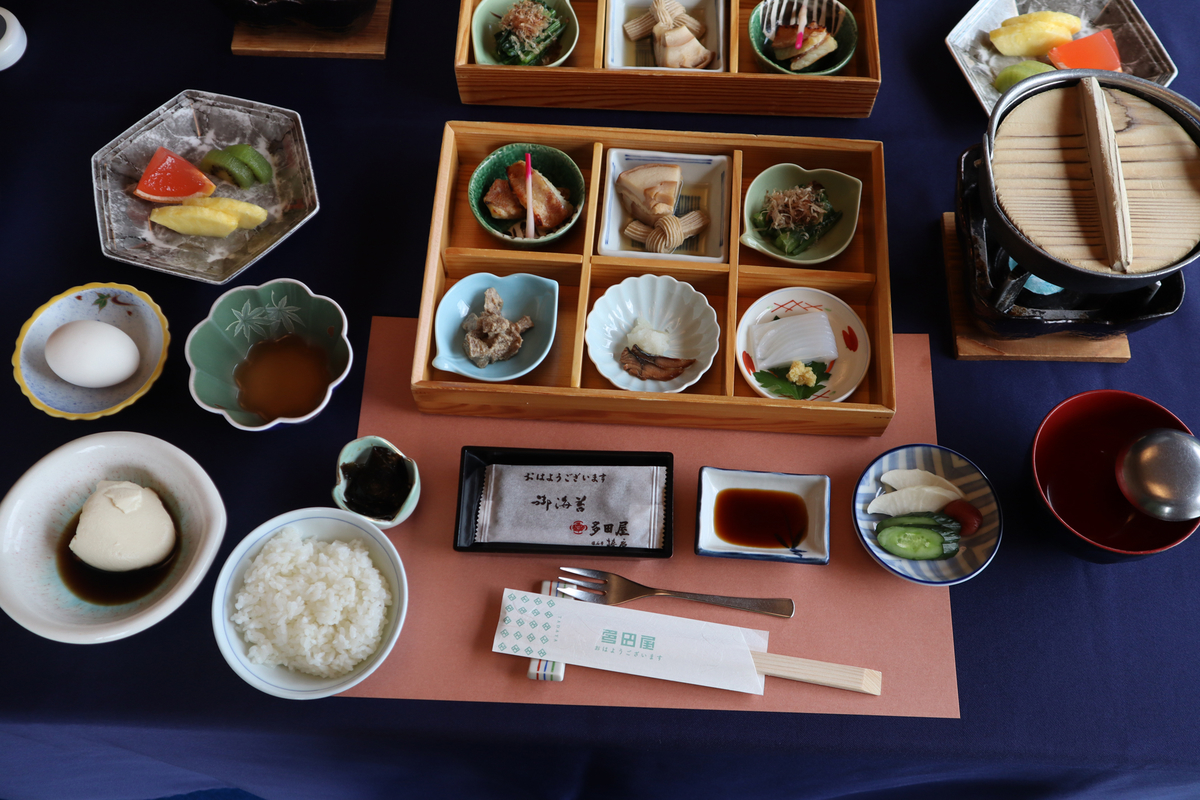 ご飯に温泉玉子、自家製豆腐にデザート。ご飯は夜に引き続いておかわりしました。