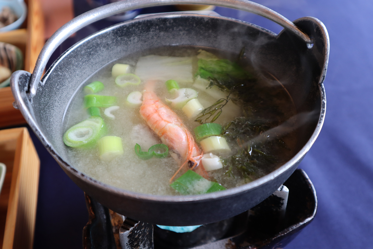お味噌汁は海沿いのお宿らしく海老、いわしのつみれ、海藻系など海の幸が入った美