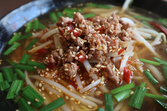 台湾ラーメンの全体図です。ニラ、モヤシ、鷹の爪と挽き肉がのっていました。