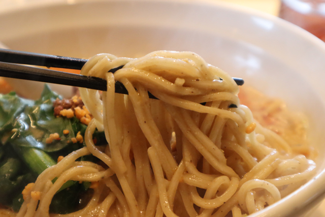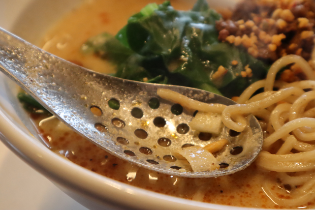 スープは香り高い自家製辣油、芝麻醤とベースに地鶏から取ったスープを合わせたも