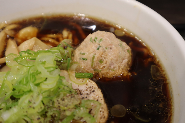 全体図です。きざみネギ、メンマ、チャーシューと鶏団子がのっていました。