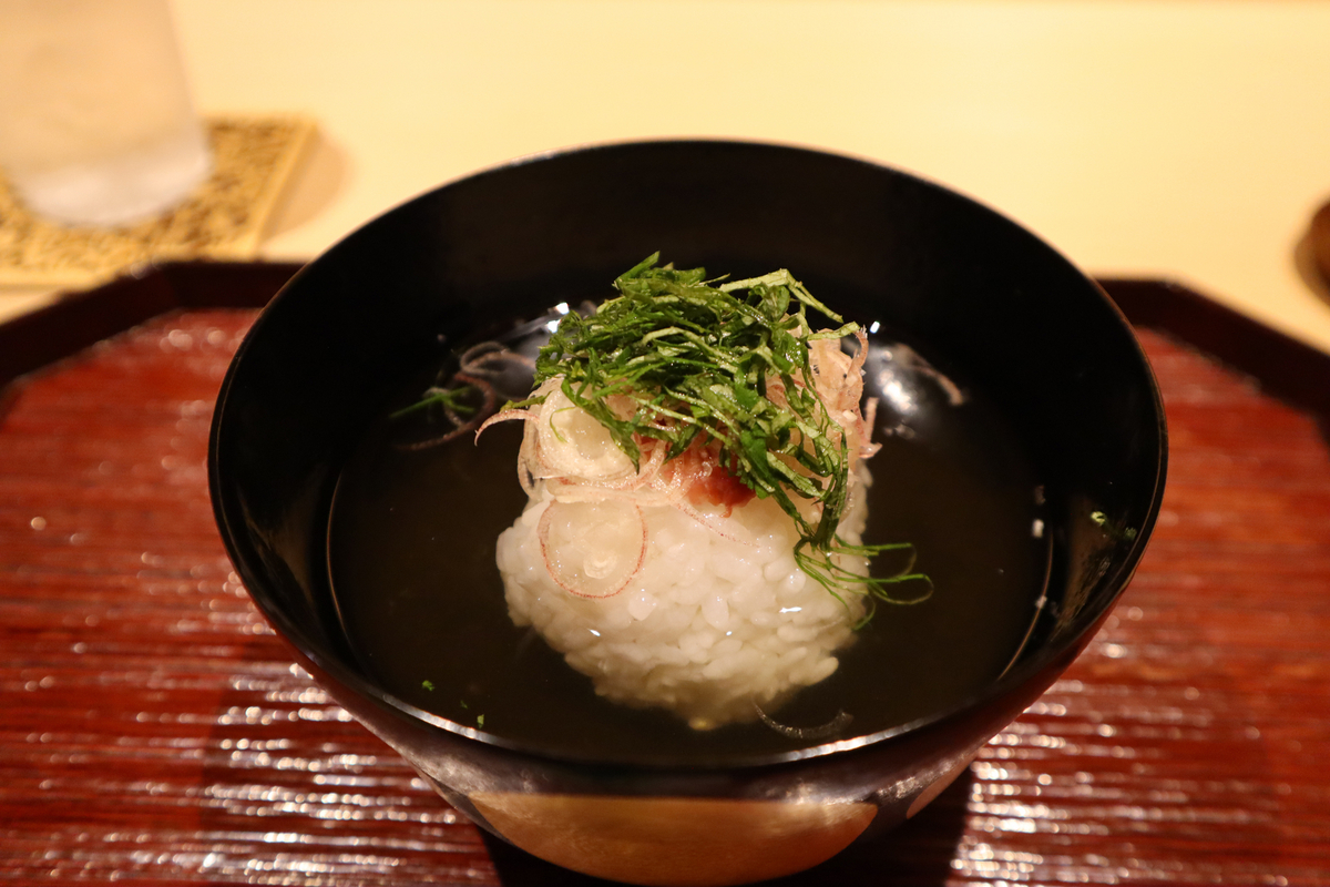 お食事は夏らしくサッパリと冷やし茶漬けです。梅に大葉に茗荷がのって文字通りサ
