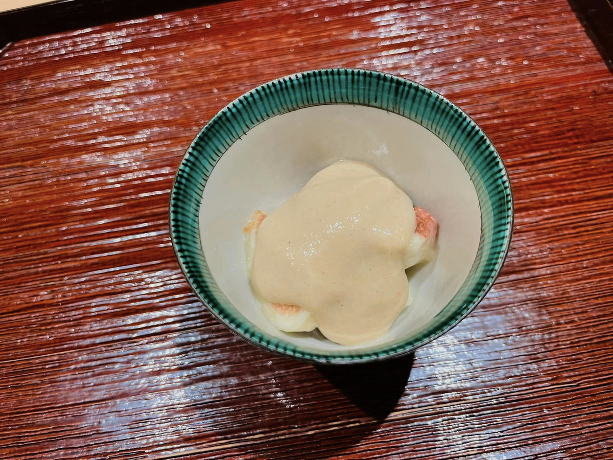 赤イカとキャビアです。キャビアの塩分と赤イカの味わいが抜群の組合せ。