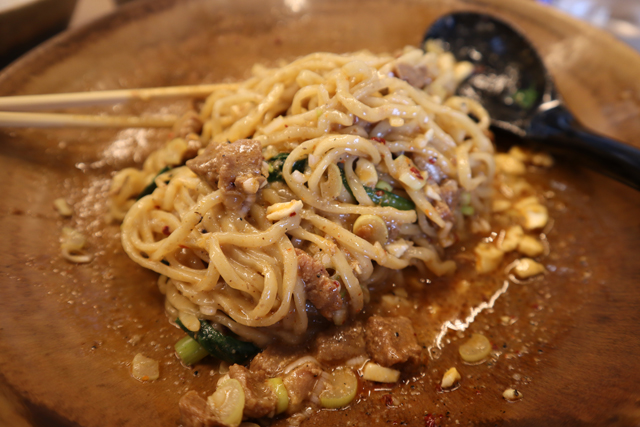 全体図です。小松菜、ナッツ、肉味噌、鷹の爪(!?)と花椒がのっていました。
