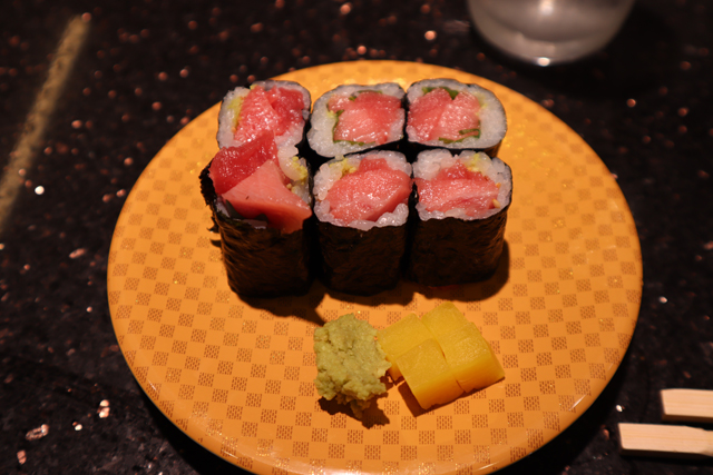 トロ鉄火巻。スタッフが気合いを入れて巻いて下さいました。沢庵とワサビ、大葉が