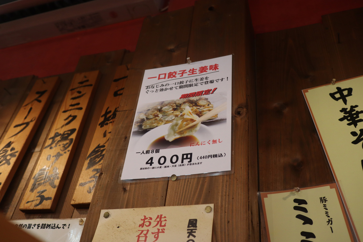 一口餃子生姜風味。酢醤油をつけずにそのまま頂くと生姜の味わいが美味しく♪