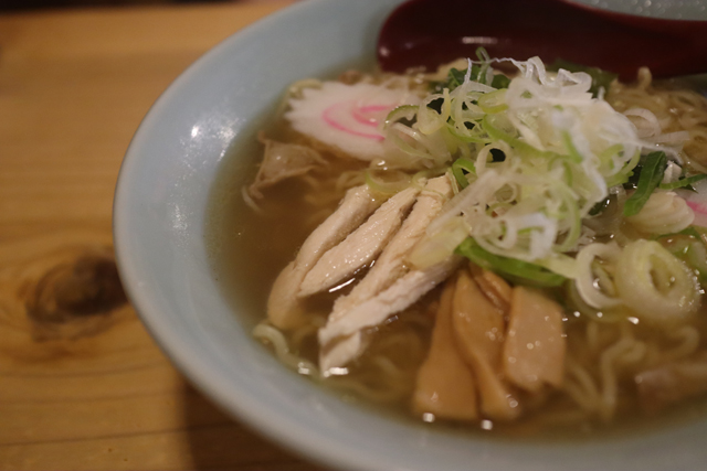 〆の中華そばの全体図です。きざみネギ、なると、ワカメ、鶏ささみ肉と大阪羽曳野