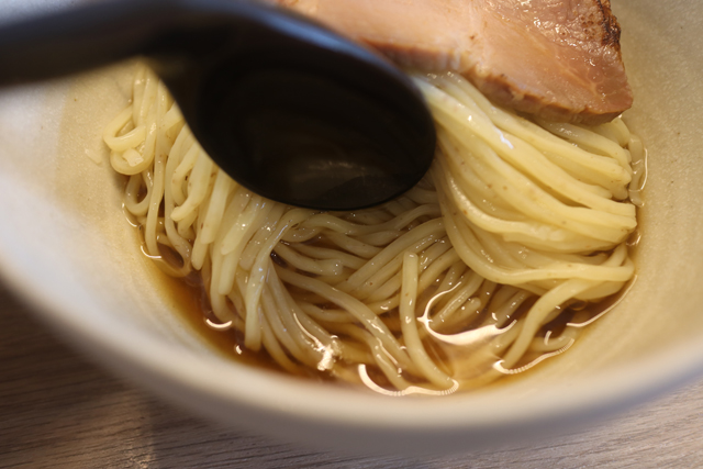 麺は中太の全粒粉のほぼストレート麺です。まずはこちらを麺の下に敷かれているス
