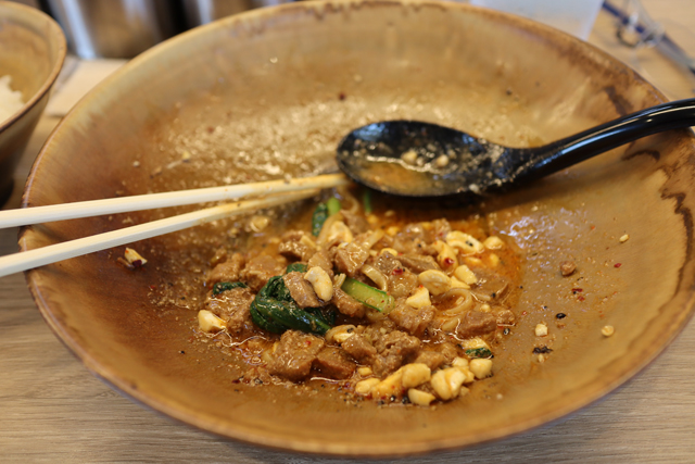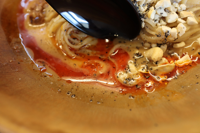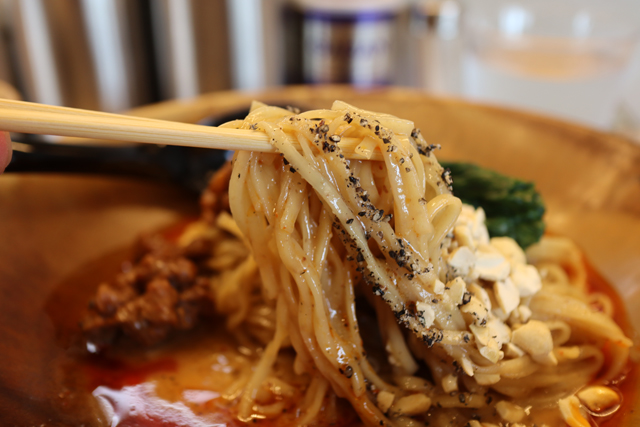自家製辣油と芝麻醤、花椒の香りが漂うタレがたっぷり。個人的には辛さはほどほど